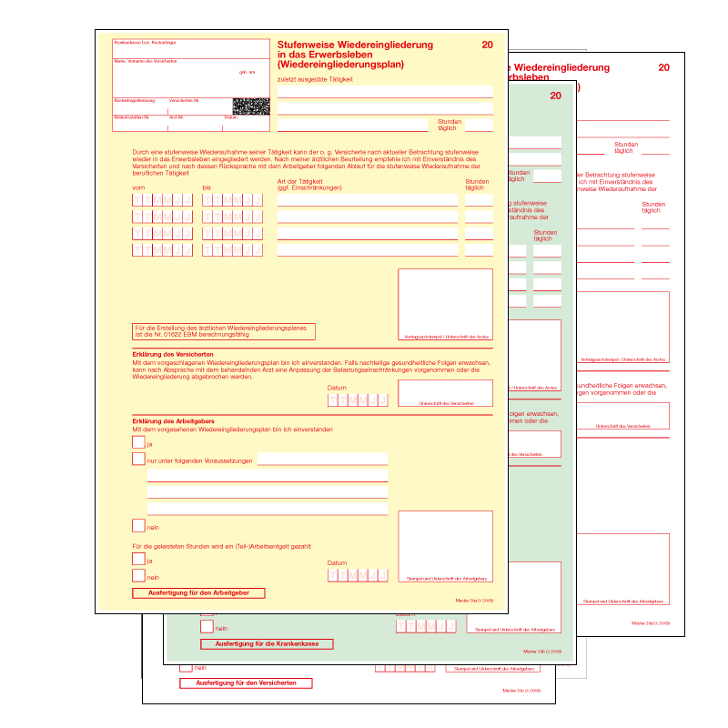 KV-Vordrucke Muster 20 Stufenweise Wiedereingliederung in das Erwerbsleben Format: DIN A4 (210 x 297 mm) 4-Fach-Lagen (nicht selbstdurchschreibend) für alle Praxisdrucker geeignet. 1 = 25 Sätze