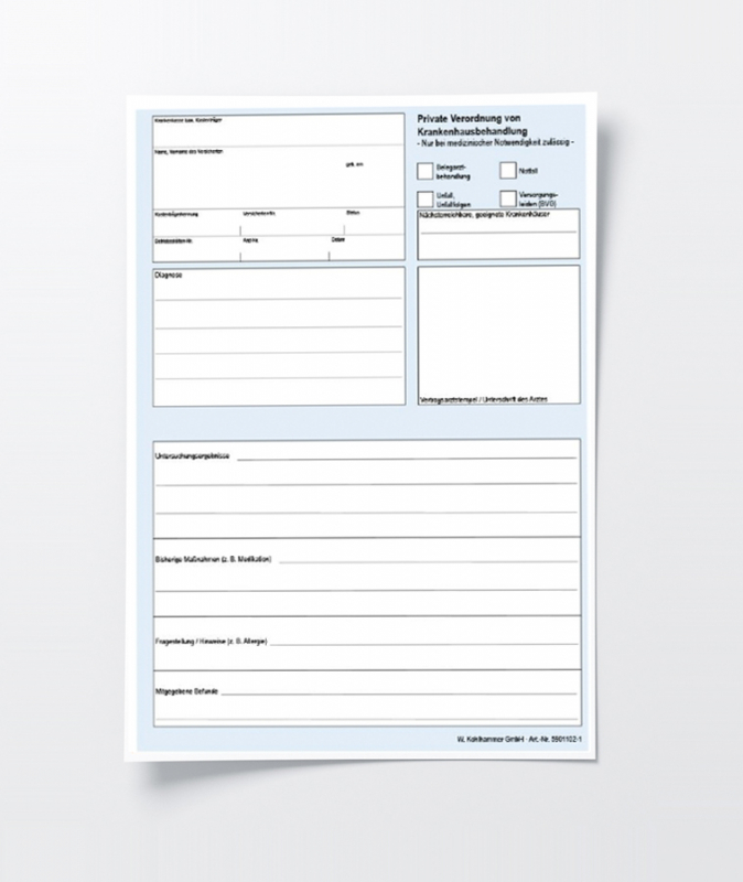 Vordrucke "Krankenhauseinweisung Privatpatient" Format DIN A5 hoch (15 x 21 cm) blanco für den Praxisdrucker (lose Blätter). Qualitätspapier (90 g/m2) für sicheren Druck mit jedem Praxisdrucker mit jeder gängigen Praxissoftware bedruckbar. 1 Verpackungseinheit (VPE) = 100 Vordrucke